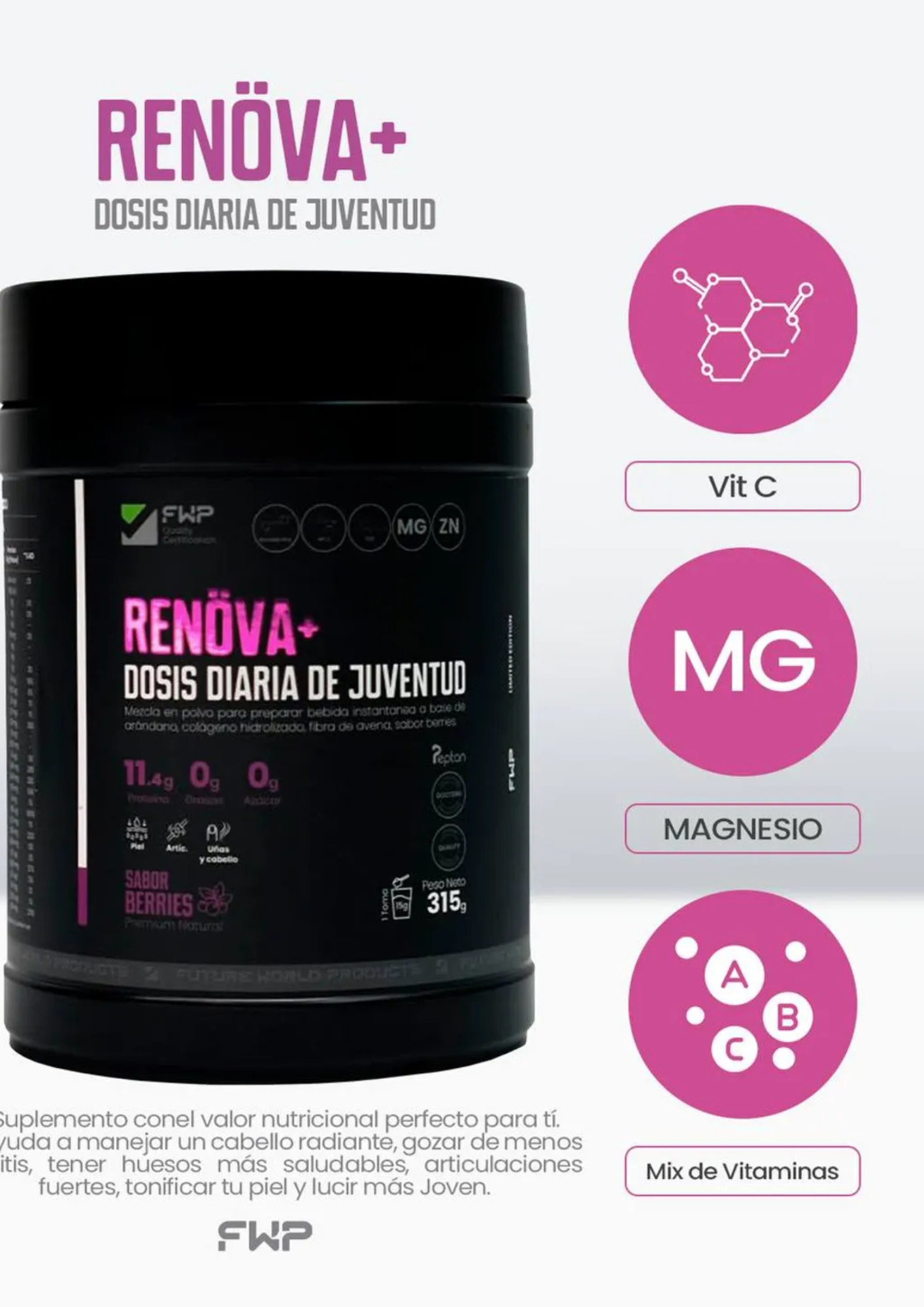 Renöva+ es un suplemento premium que combina colágeno hidrolizado con Biopéptidos activos, antioxidantes y nutrientes esenciales que trabajan juntos para rejuvenecer, fortalecer y mejorar tu bienestar desde la primera toma.
